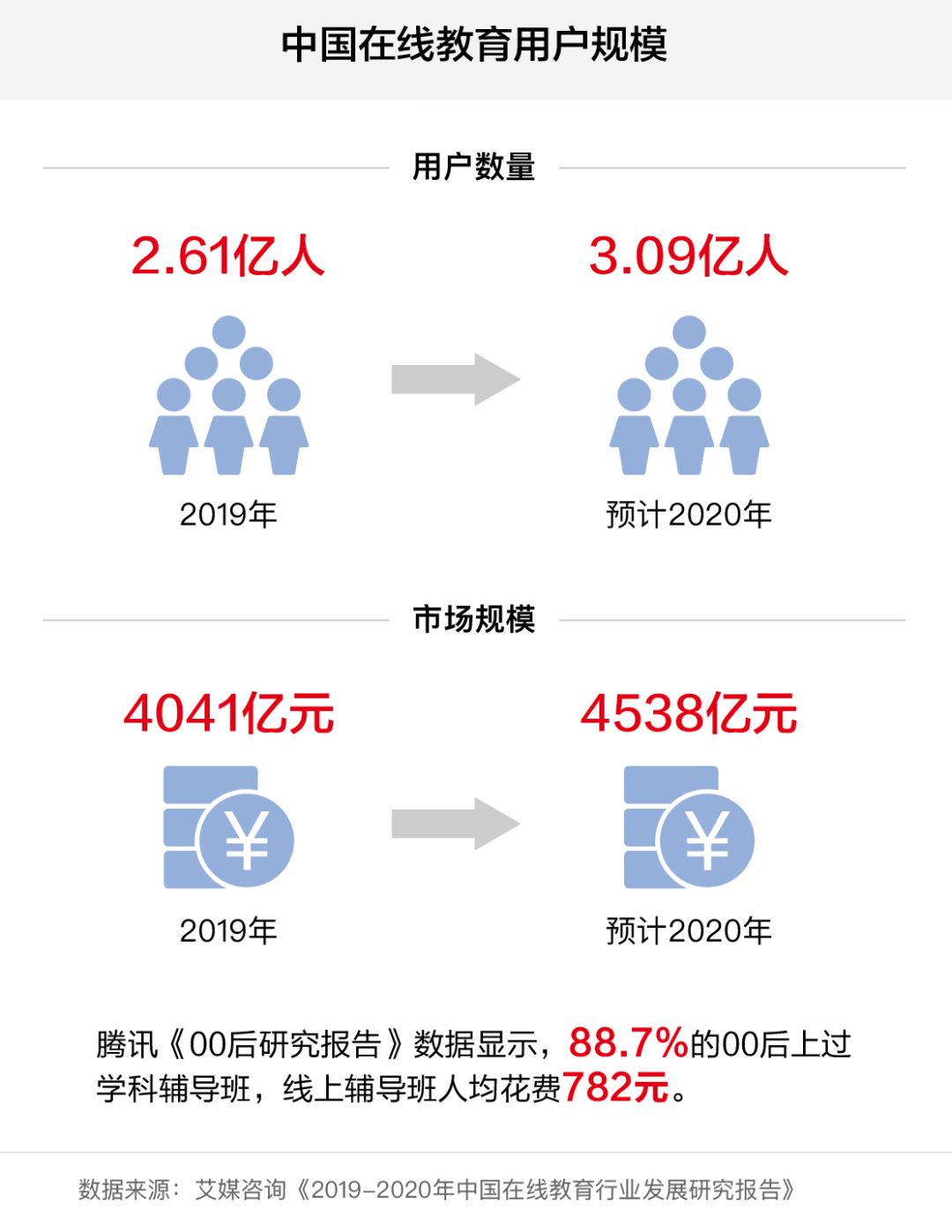 據(jù)艾傳媒咨詢《2019-2020中國(guó)在線教育產(chǎn)業(yè)發(fā)展研究報(bào)告》顯示,2019年中國(guó)在線教育用戶規(guī)模達(dá)到2.61億,市場(chǎng)規(guī)模達(dá)到4041億元。預(yù)計(jì)2020年中國(guó)在線教育用戶規(guī)模將達(dá)到3.09億。市場(chǎng)規(guī)模將達(dá)到4538億元,同比增長(zhǎng)15.5%;騰訊《00后研究報(bào)告》顯示,88.7%的00后學(xué)生參加過(guò)學(xué)科輔導(dǎo)班,在線輔導(dǎo)班平均費(fèi)用為782元。