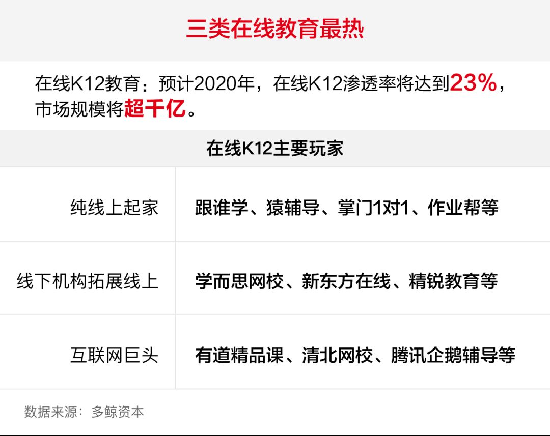 隨著升學(xué)競(jìng)爭(zhēng)的長(zhǎng)期存在,K12課外輔導(dǎo)已經(jīng)成為不可動(dòng)搖的需要。多鯨資本數(shù)據(jù)顯示,截至2018年,國(guó)內(nèi)K12學(xué)生人數(shù)超過(guò)1.74億,相應(yīng)的K12課外輔導(dǎo)市場(chǎng)超過(guò)4000億元。傳統(tǒng)教育機(jī)構(gòu)、互聯(lián)網(wǎng)巨頭、互聯(lián)網(wǎng)團(tuán)隊(duì)等不同背景的創(chuàng)業(yè)者紛紛涌入,以英語(yǔ)、數(shù)學(xué)為主。其中優(yōu)質(zhì)項(xiàng)目吸金能力強(qiáng),紅杉中國(guó)、GGV、IDG等一線資本均完成布局。過(guò)去一年,在線k12企業(yè)融資金額最高的是“一對(duì)一”E輪融資,融資金額3.5億美元;其次是“小盒子科技”1.5億美元的D輪融資。